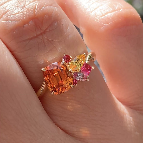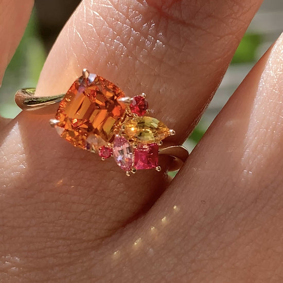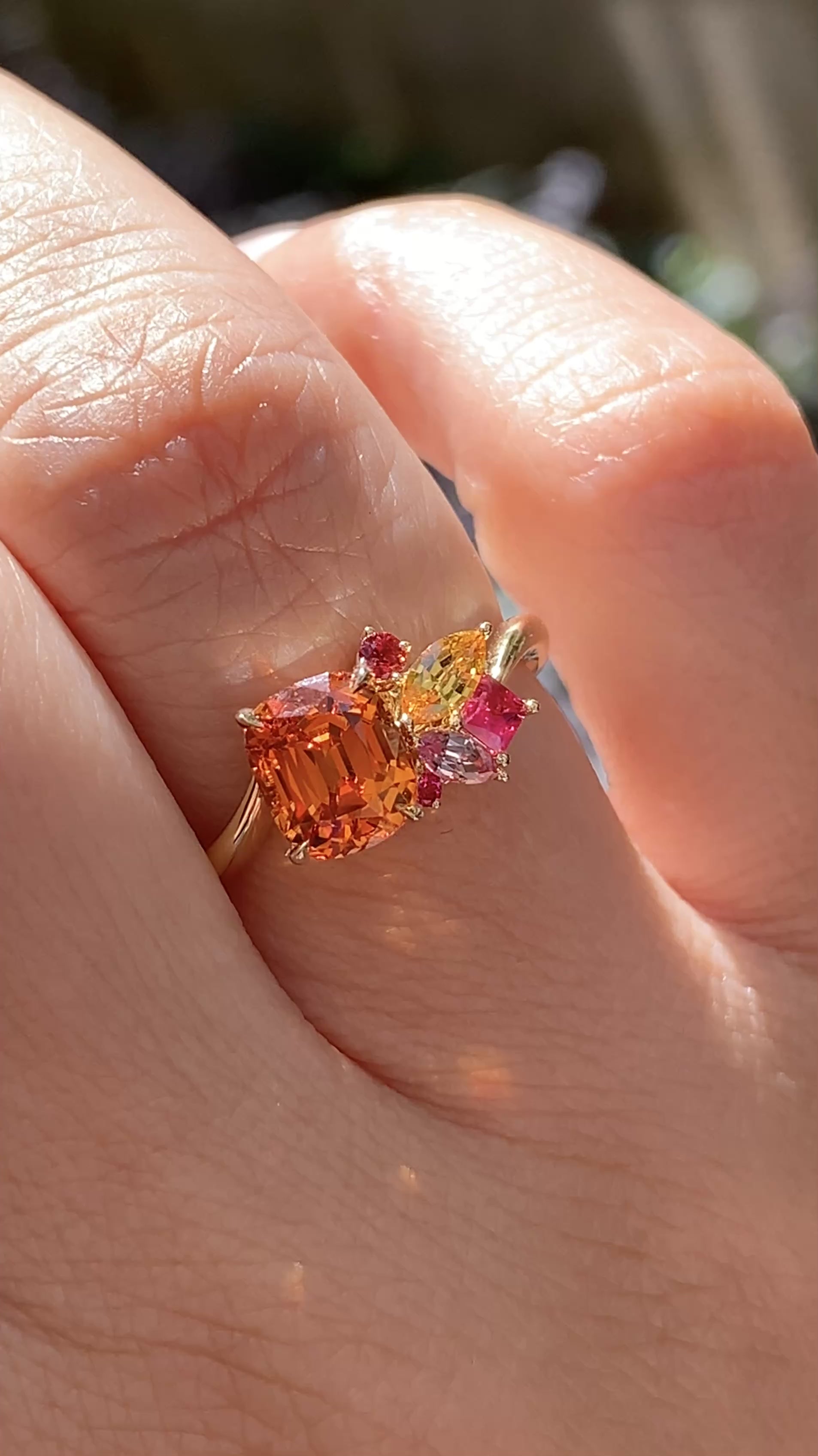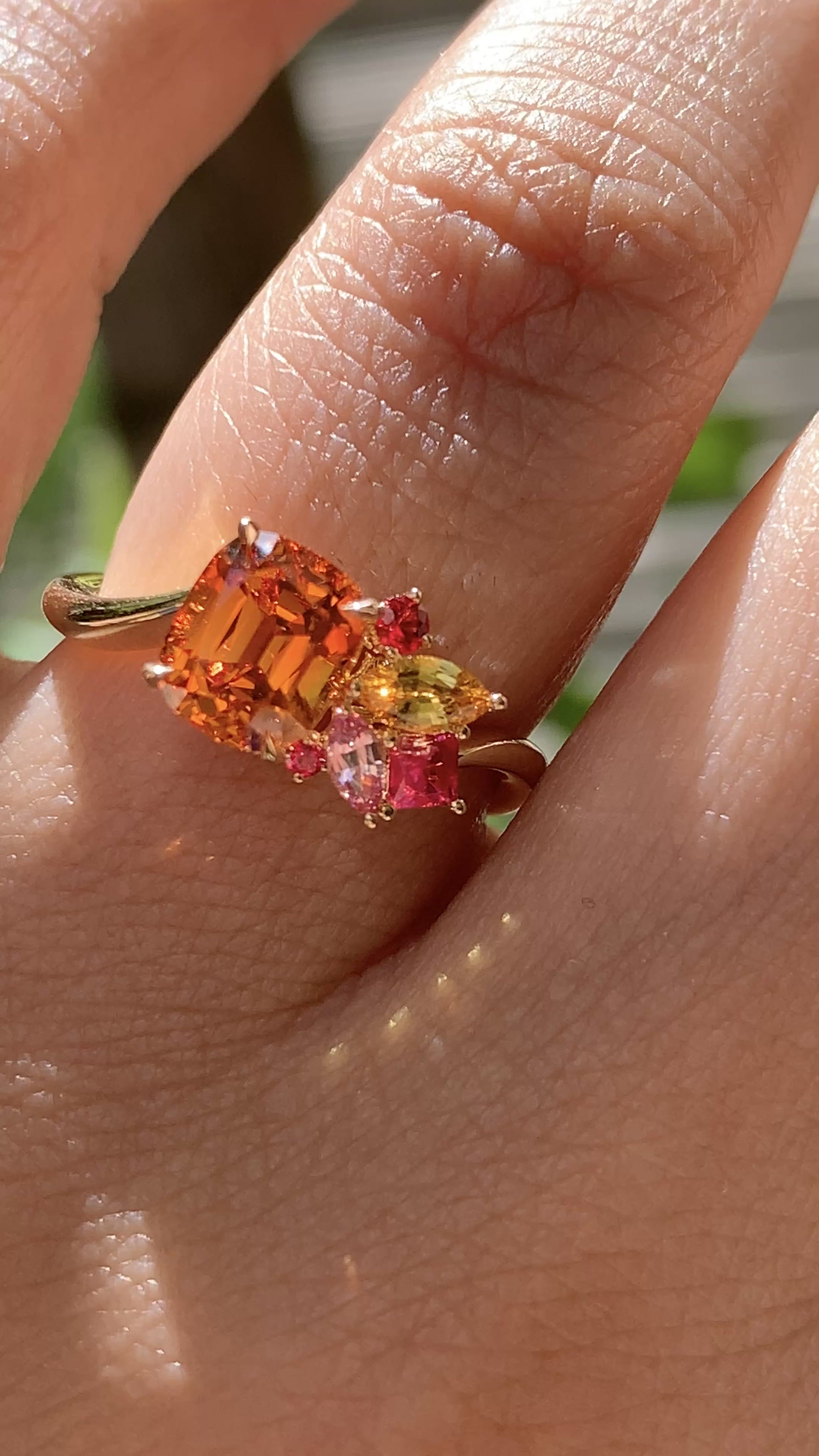 Set in my signature Candy Cluster, it’s a chorus of super neon warm gems in mixed cuts that’s joyful and playful. Finished with a fluid band that gives this modern design an element of ‘flow’, this is a ring I can rarely keep in stock.