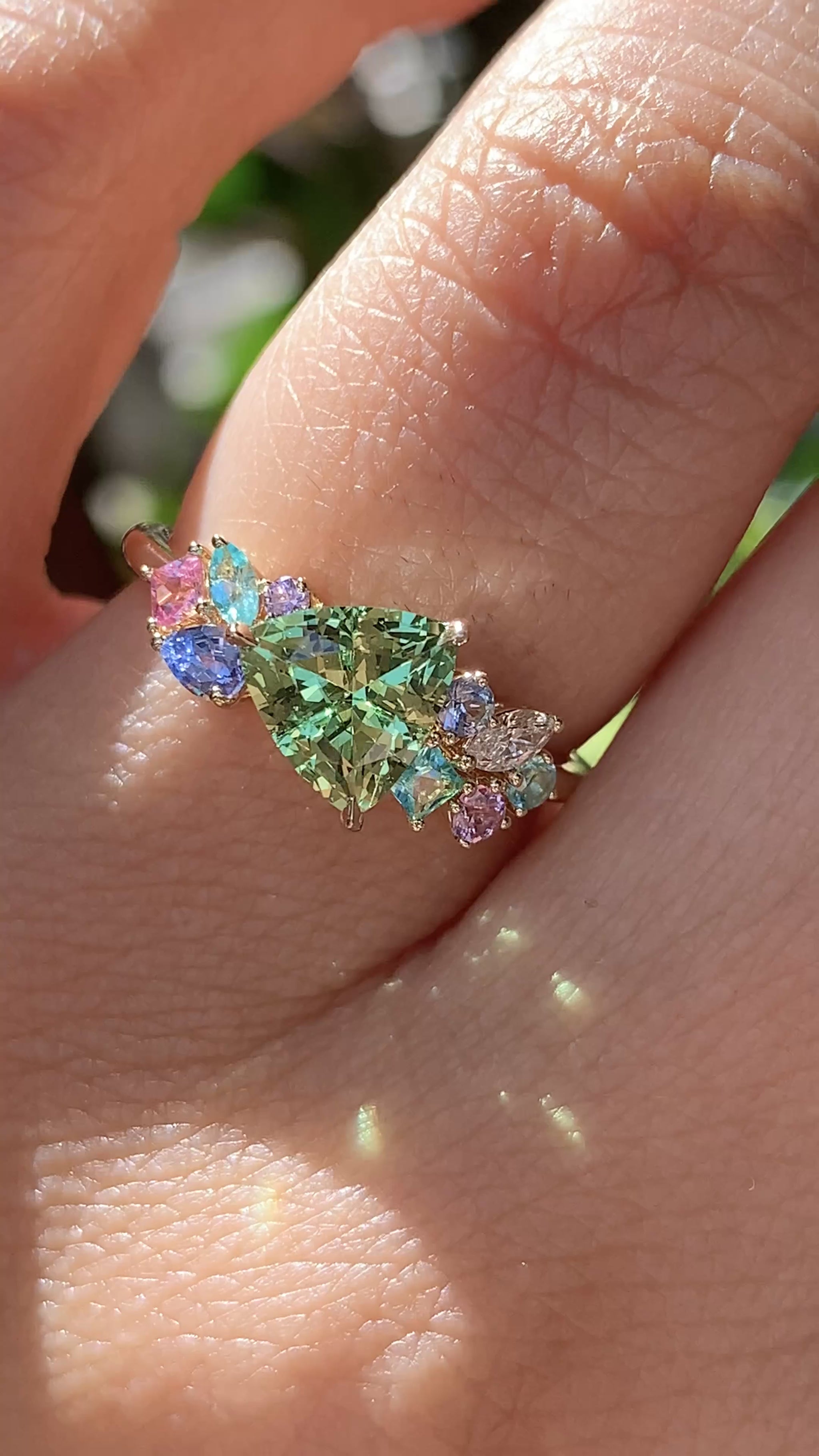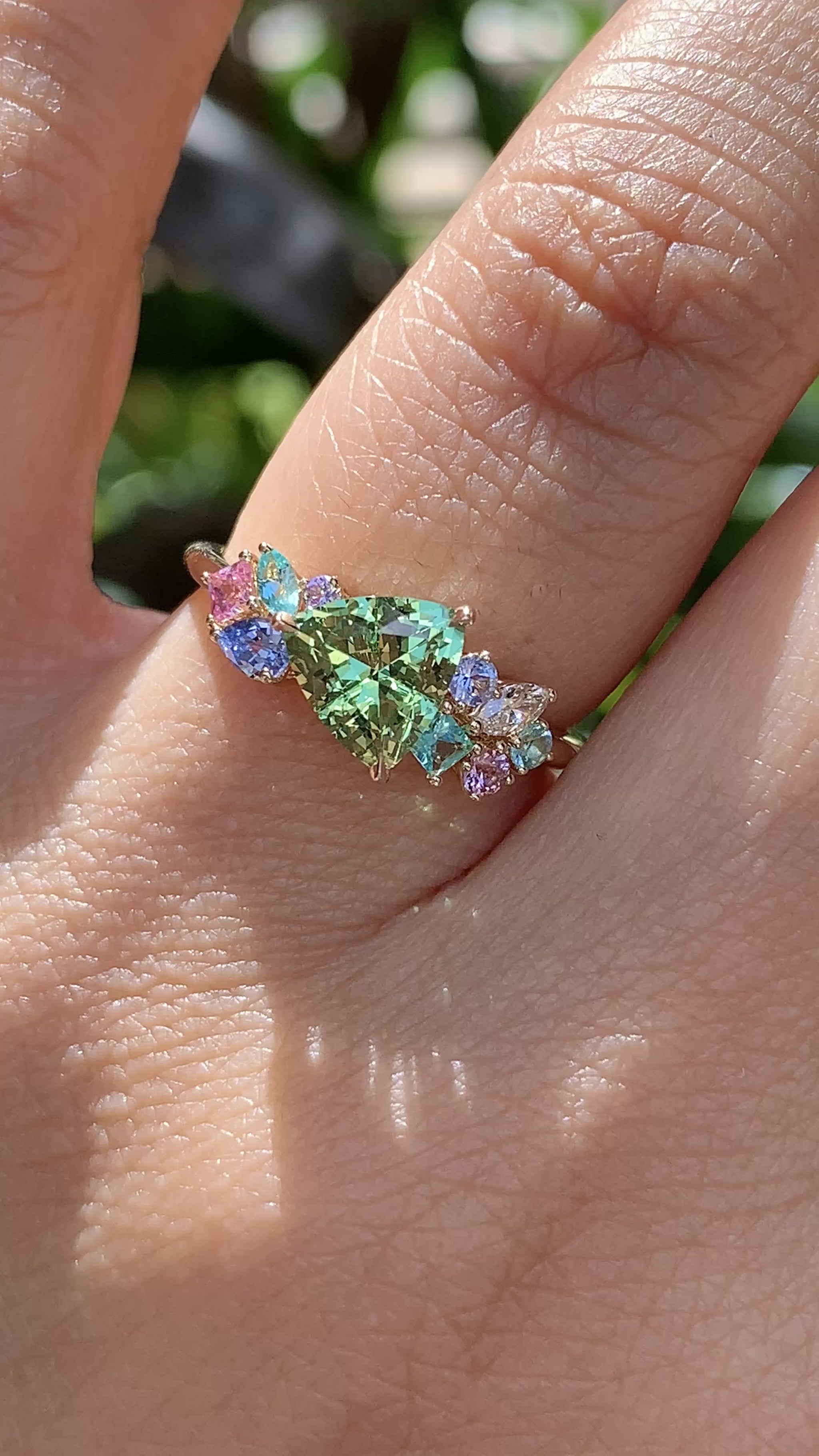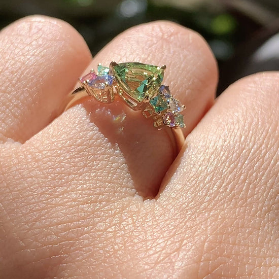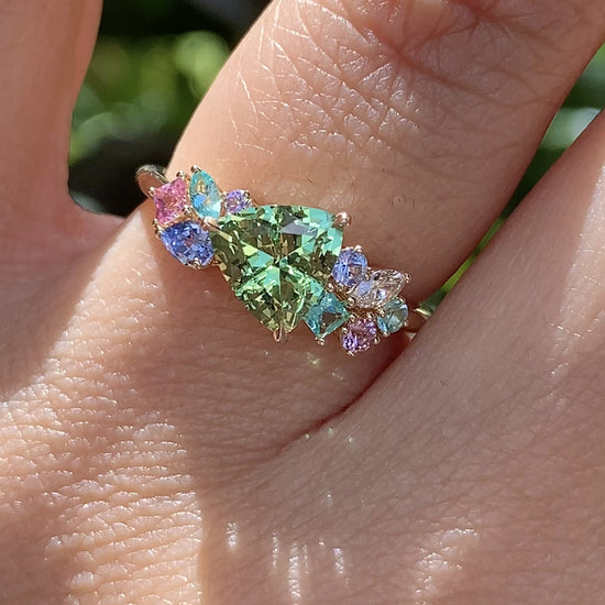 A gorgeous tapestry of tropical shades. At the center sits a lime-green Neon Tsavorite Mint Garnet, framed by complementary shades that make its glow feel even more alive.