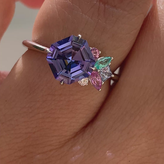A glittering box of candy tucked against a midnight-violet sky. The bold Asscher-cut Tanzanite at the heart of this ring is a rich periwinkle, a perfect blend of purple and blue.