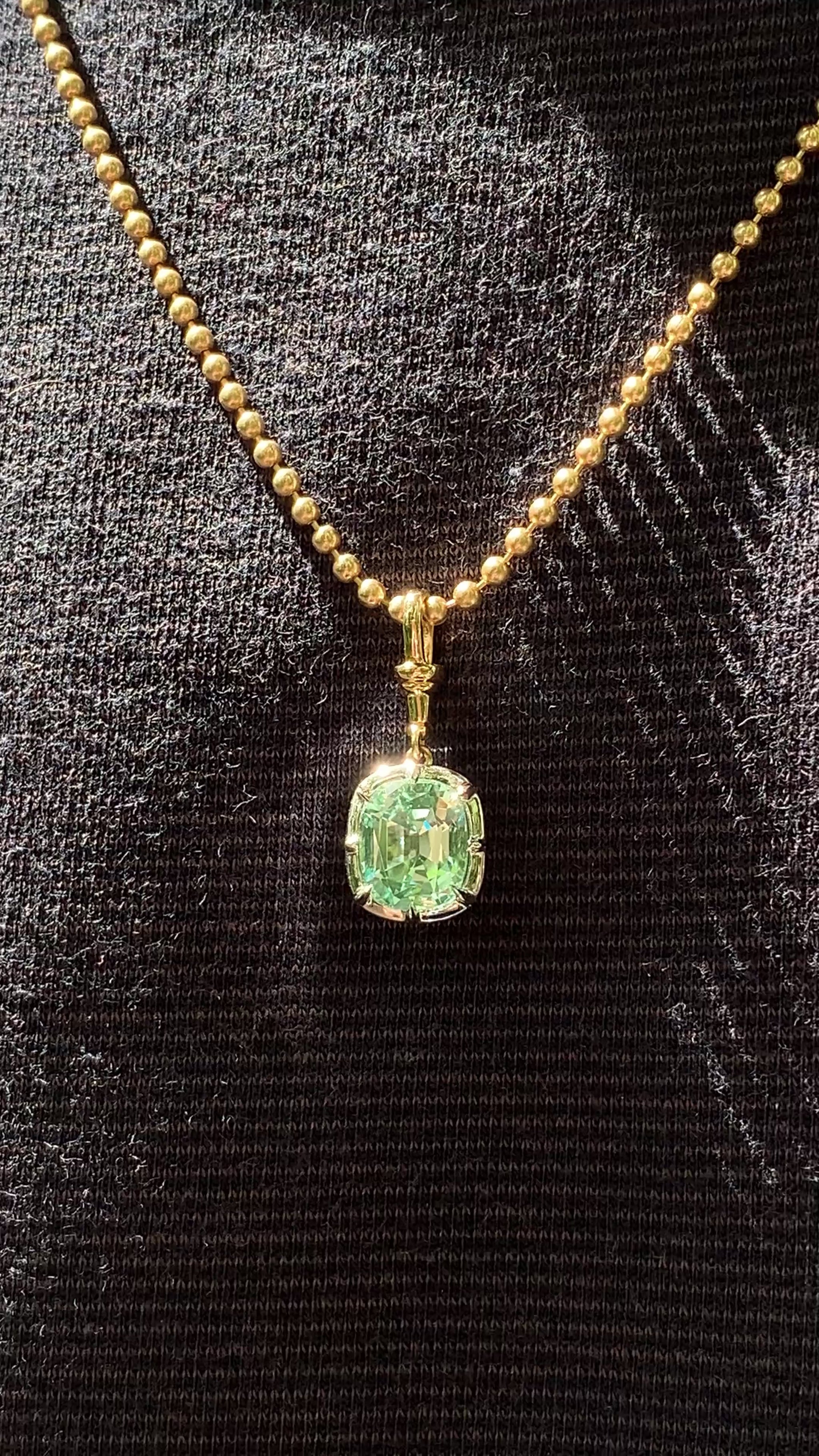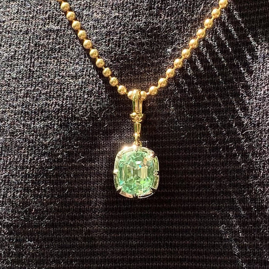 A soft wash of green that glitters like water - as if the colour is gently moving every time you turn. This pendant features a luminous chromium-bearing Lagoon Beryl, prized for a rare, unmistakable neon glow in all lighting conditions.
