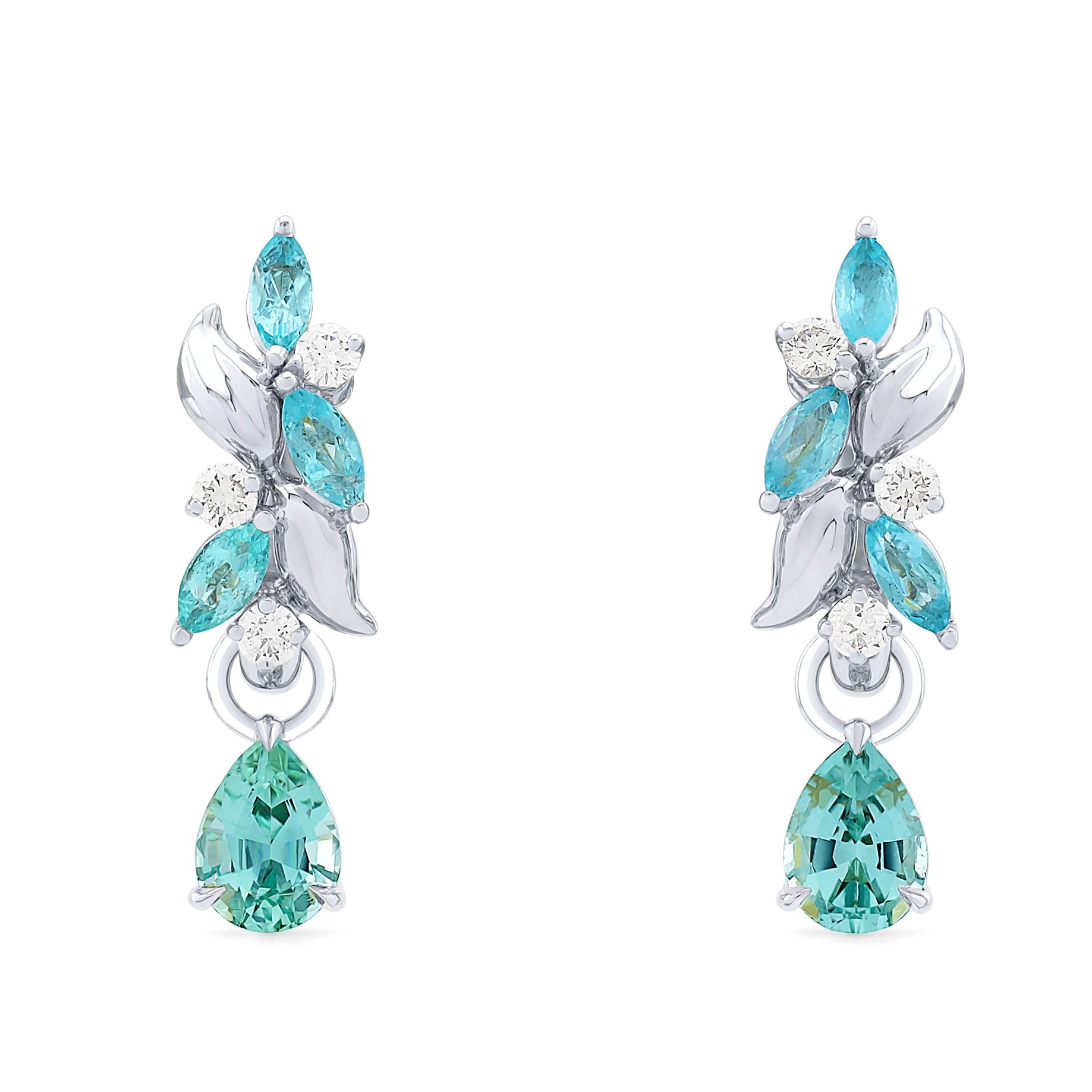 The huggies are adorned with organic, delicate White Gold leaves. The Pear-Shaped Tourmaline drops hang from detachable loops, so you can wear the huggies solo or add the drops for that full, garden-in-bloom statement.