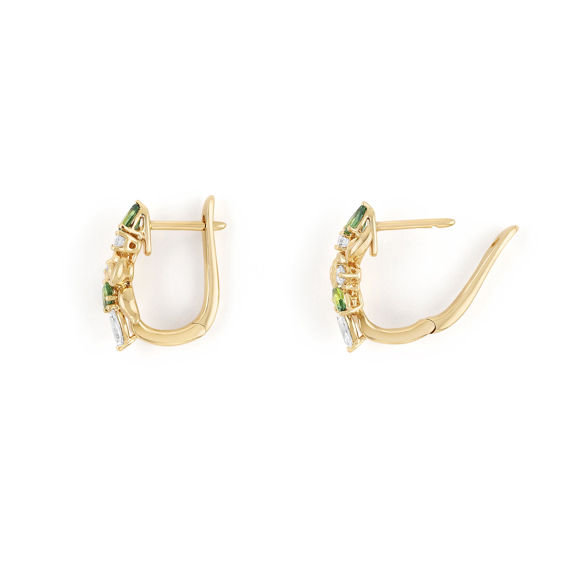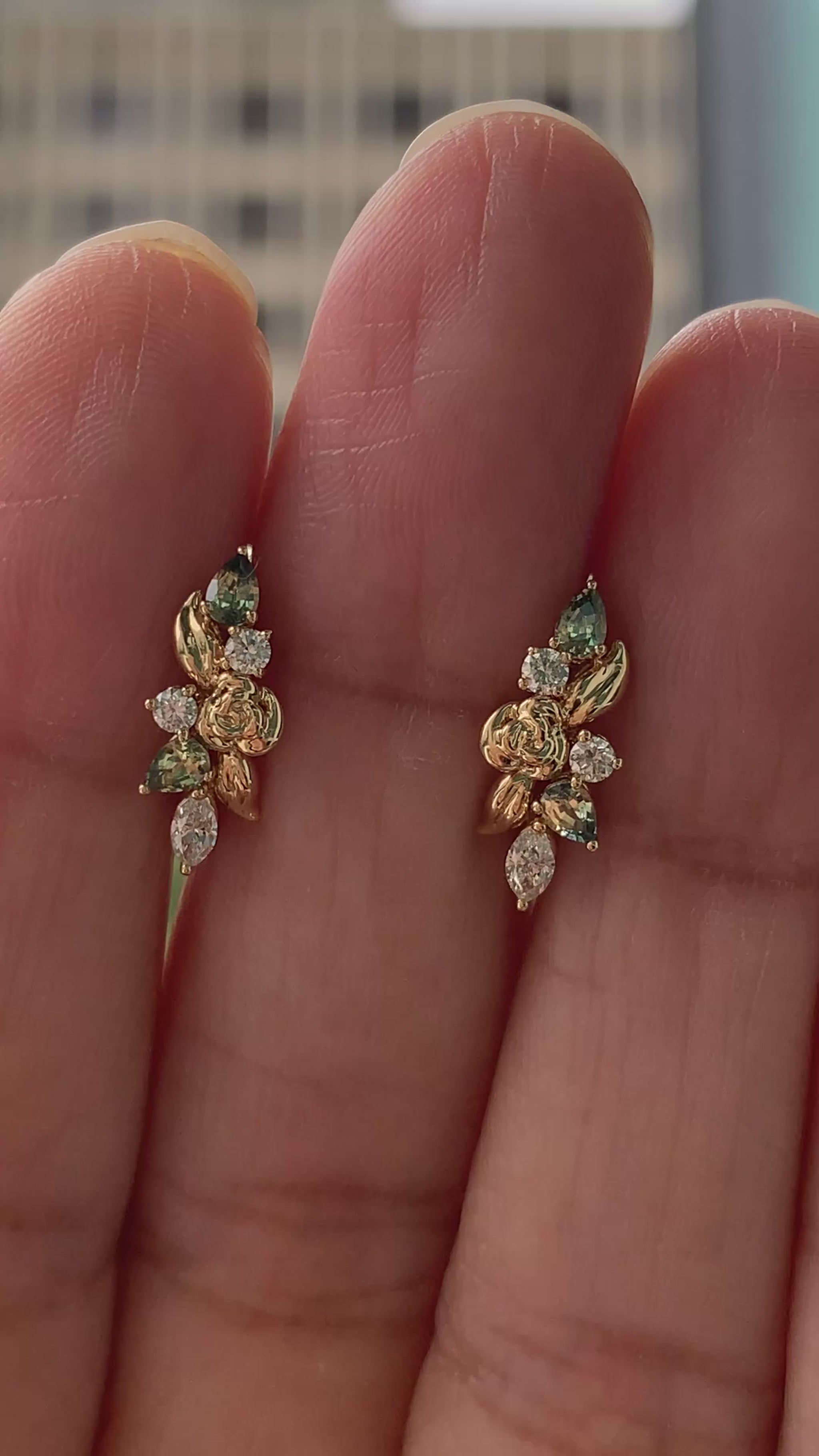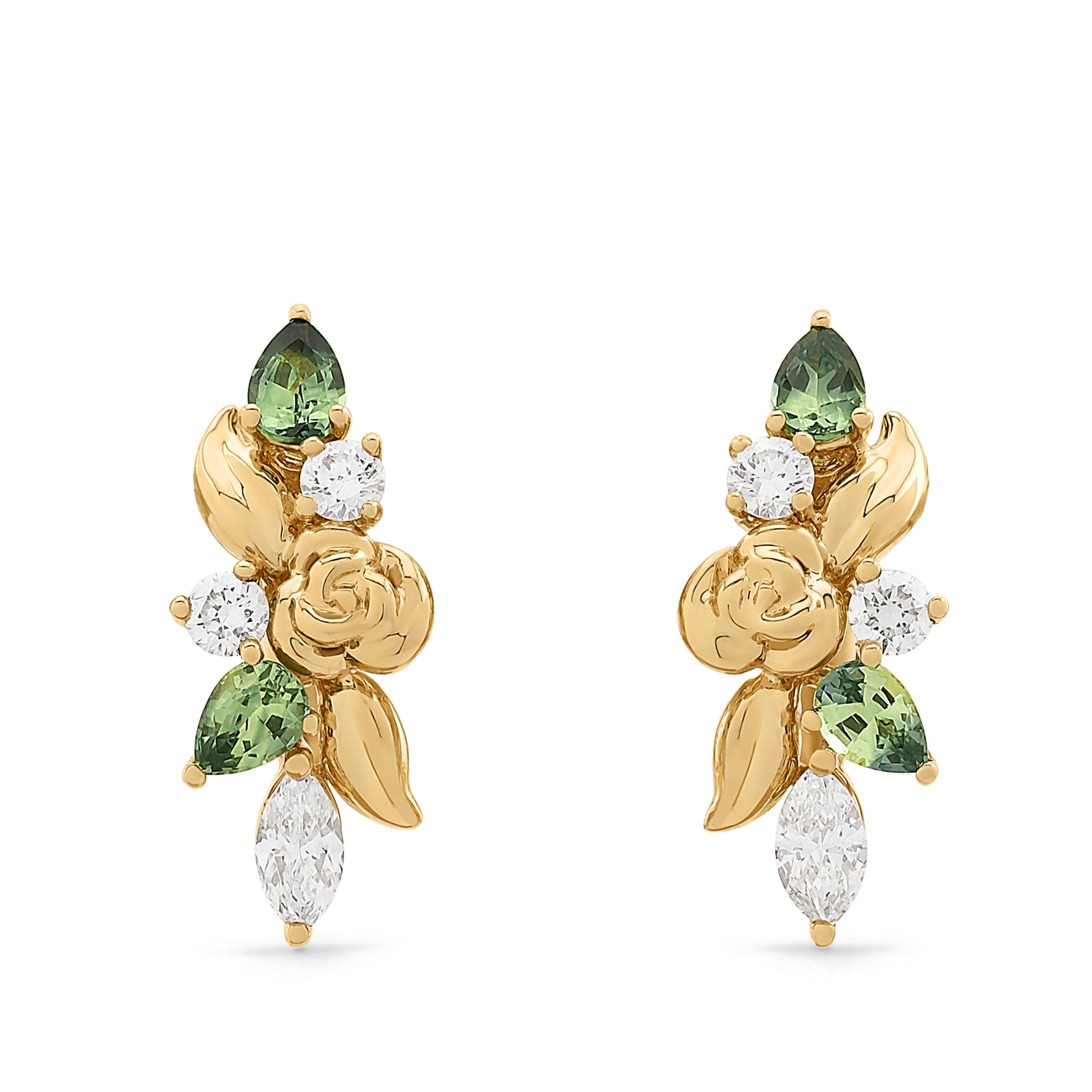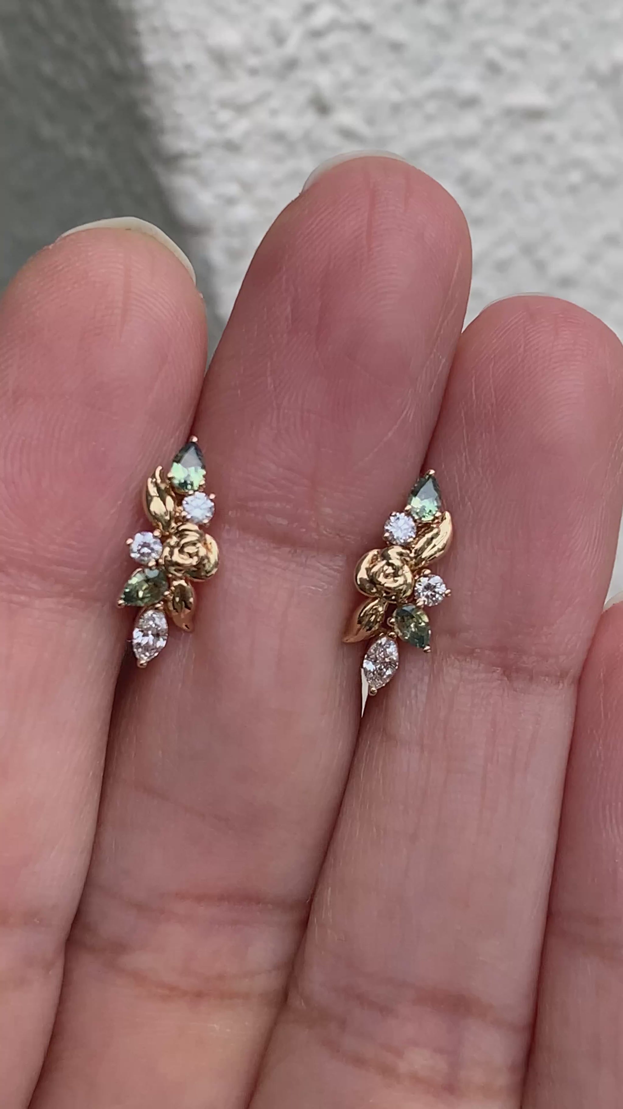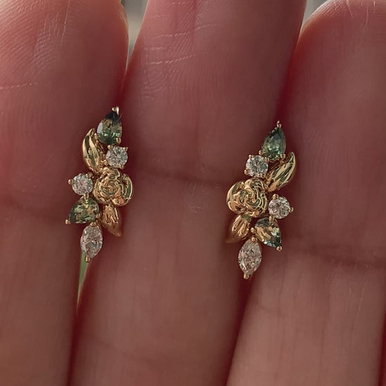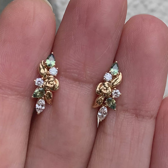 A tiny gold garden - romantic, sculptural, and quietly bold. These combine Pear-Cut Yellow-Teal Parti-Sapphires with bright Diamonds, set among organic gold leaves.