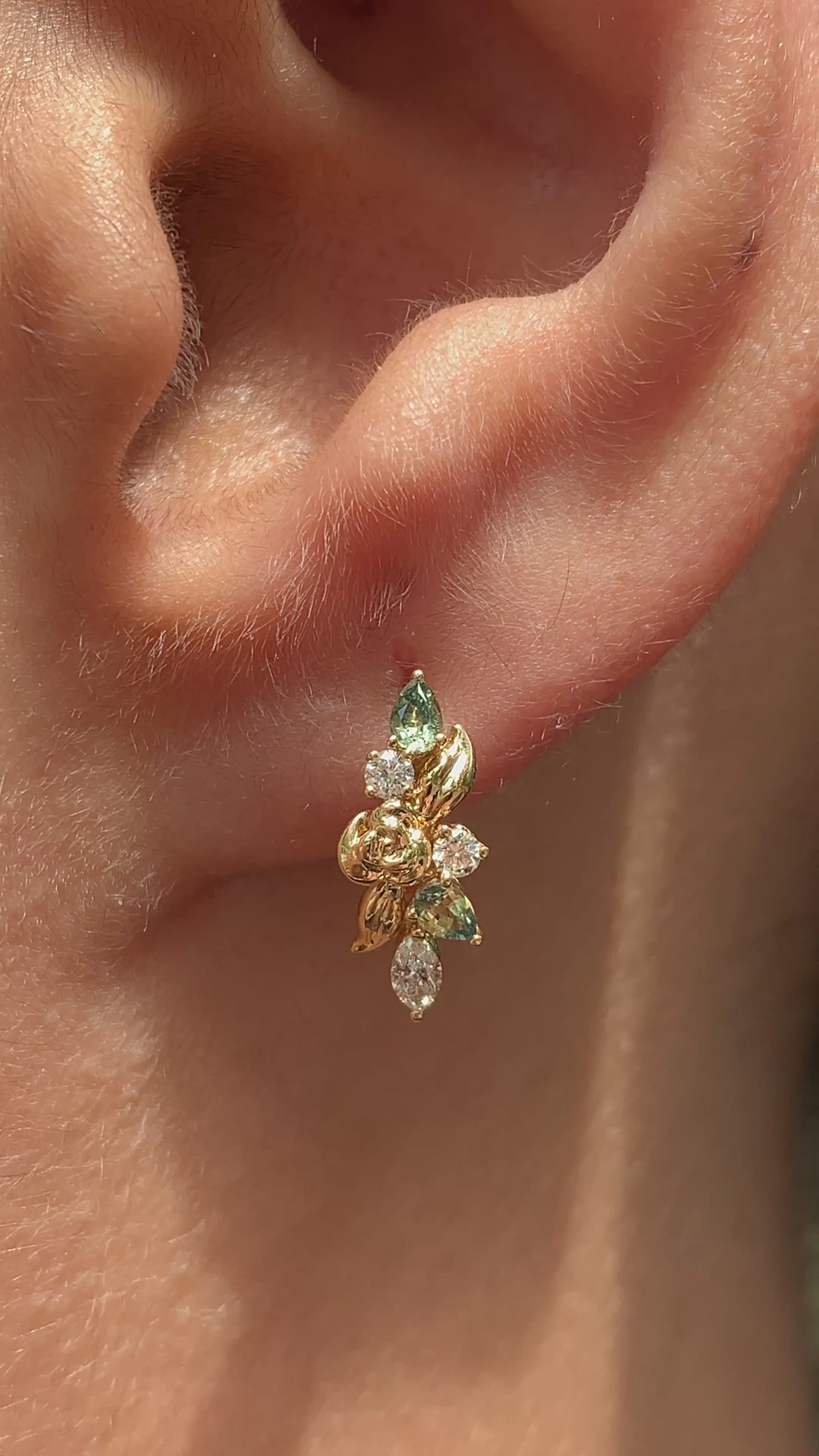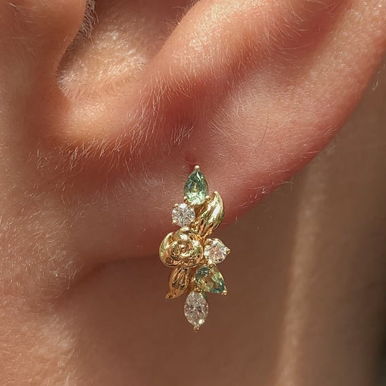 At the centre sits a gentle rose motif, adding to the Garden of Eden feel. Designed to hug the ear with an elegant profile, they’re nature-inspired earrings with real presence.